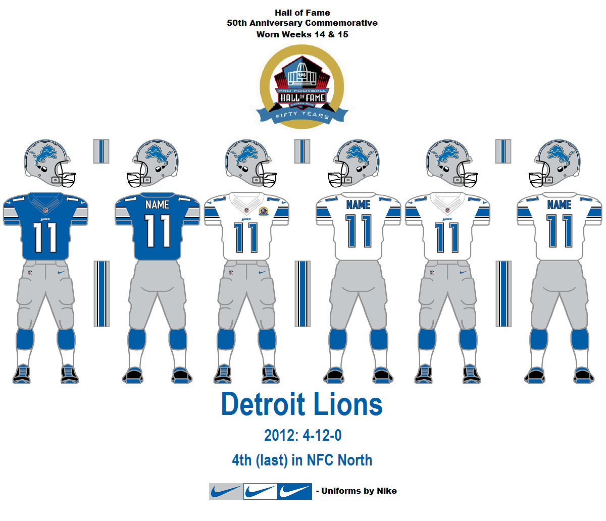 Esta vez nos toca una de las franquicias más tradicionales de la liga, los Detroit Lions. Usan una combinación de gris, celeste y blanco, que francamente me parece muy mejorable, aún siendo el gris mi color favorito.